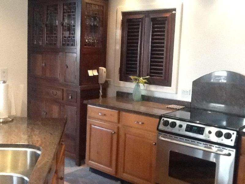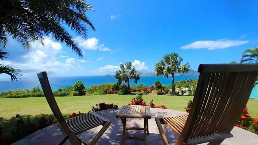 The kitchen opens out to a fantastic view of the Caribbean sea and the neighbouring island of St. Kitts. It boasts granite countertops and stainless steel appliances.