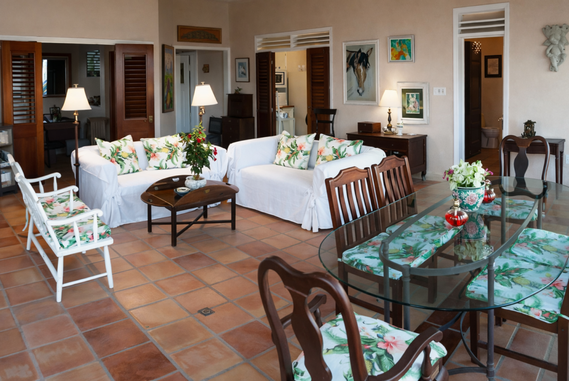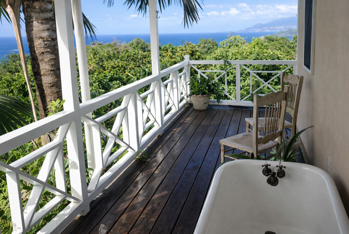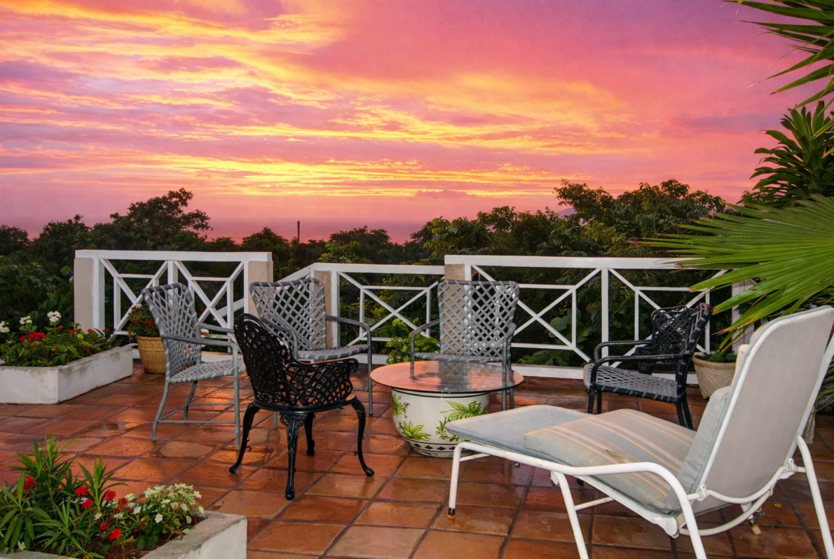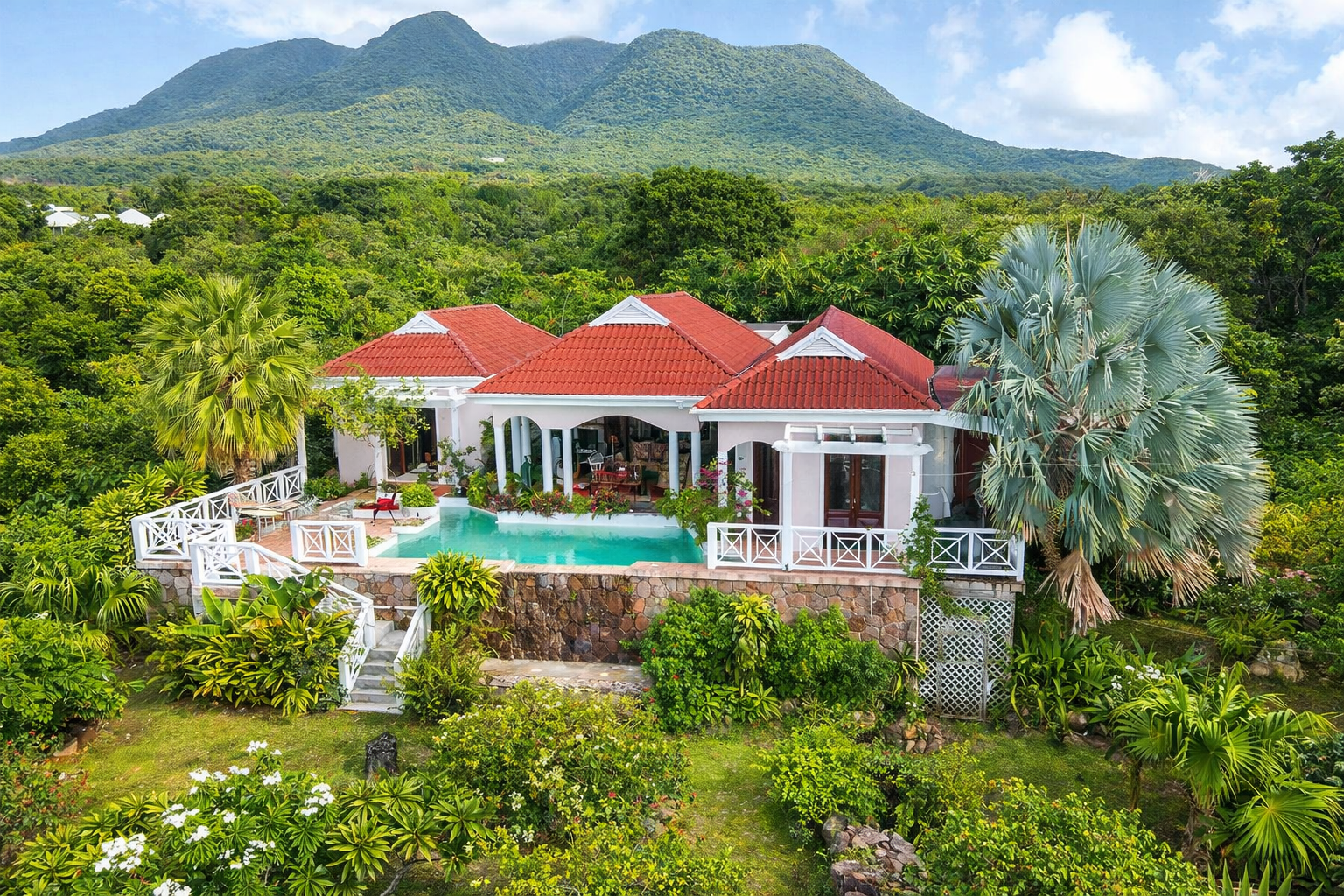 Set in 5.0 acres of lush tropical gardens with magnificent views of the Caribbean Sea to the front and Mount Nevis to the rear, this villa has three bedrooms plus a separate guest cottage. The property is located 700 ft. above sea level providing ideal temperatures year round. The villa is open in design allowing you to benefit from the fresh air and breathtaking views from every living space.