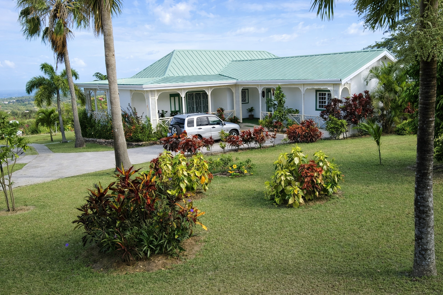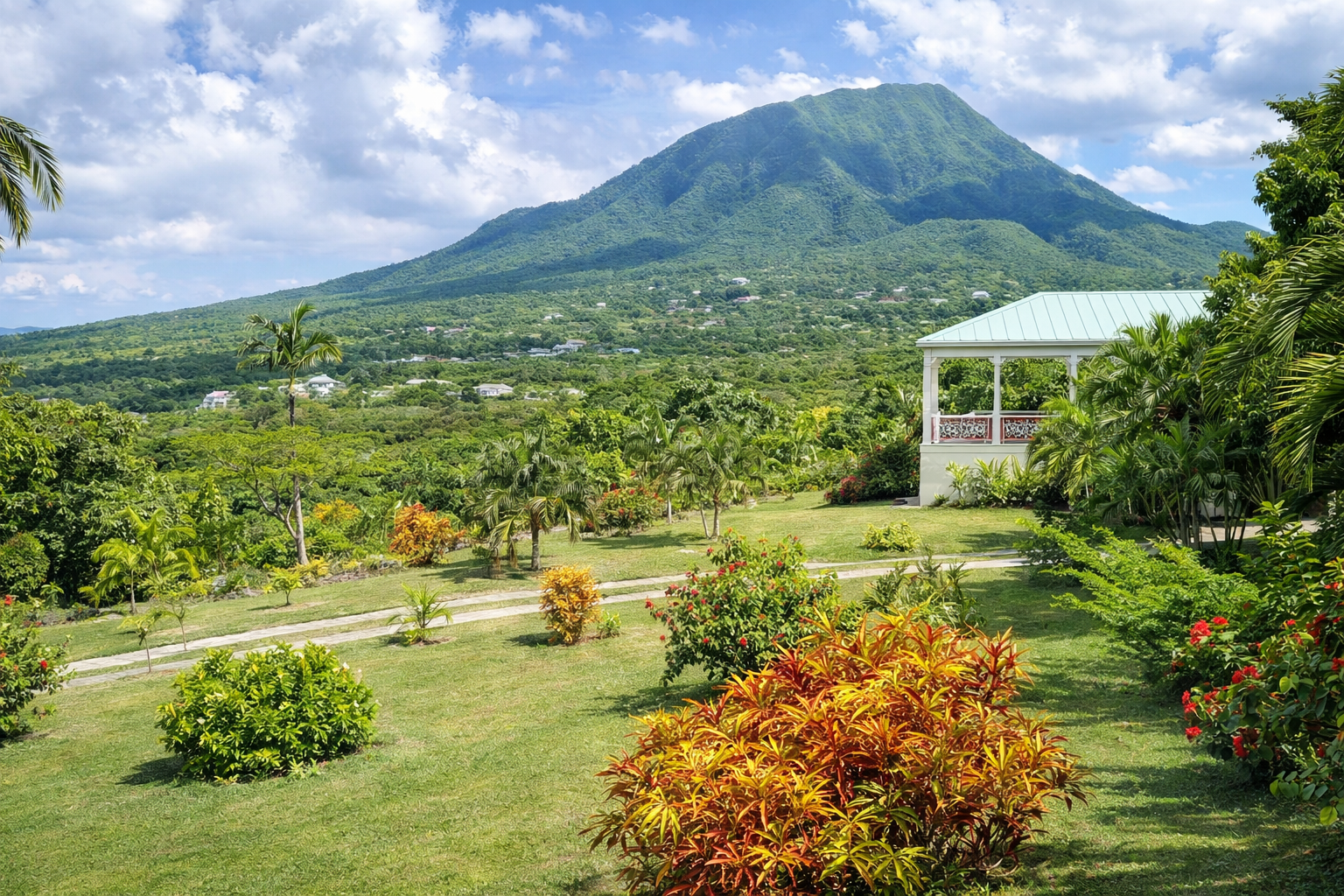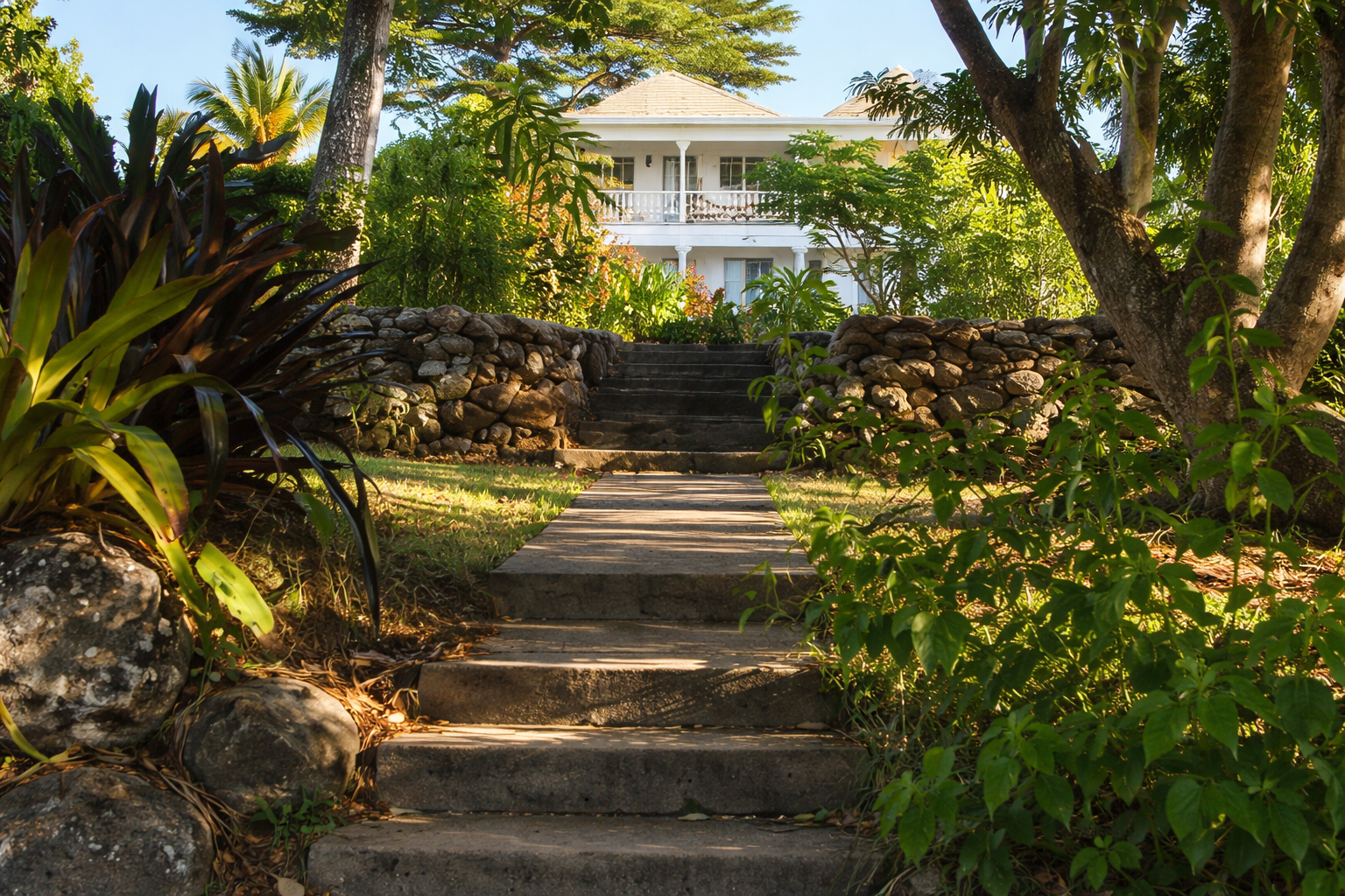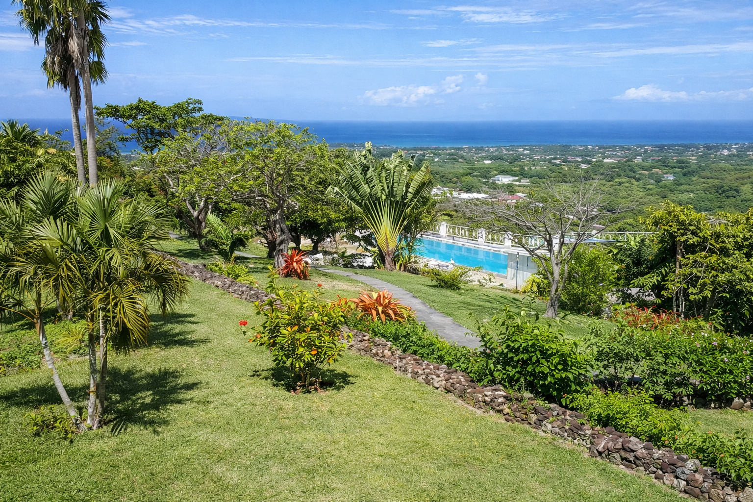 - Upper gardens with extensive lawns and a variety of palms.