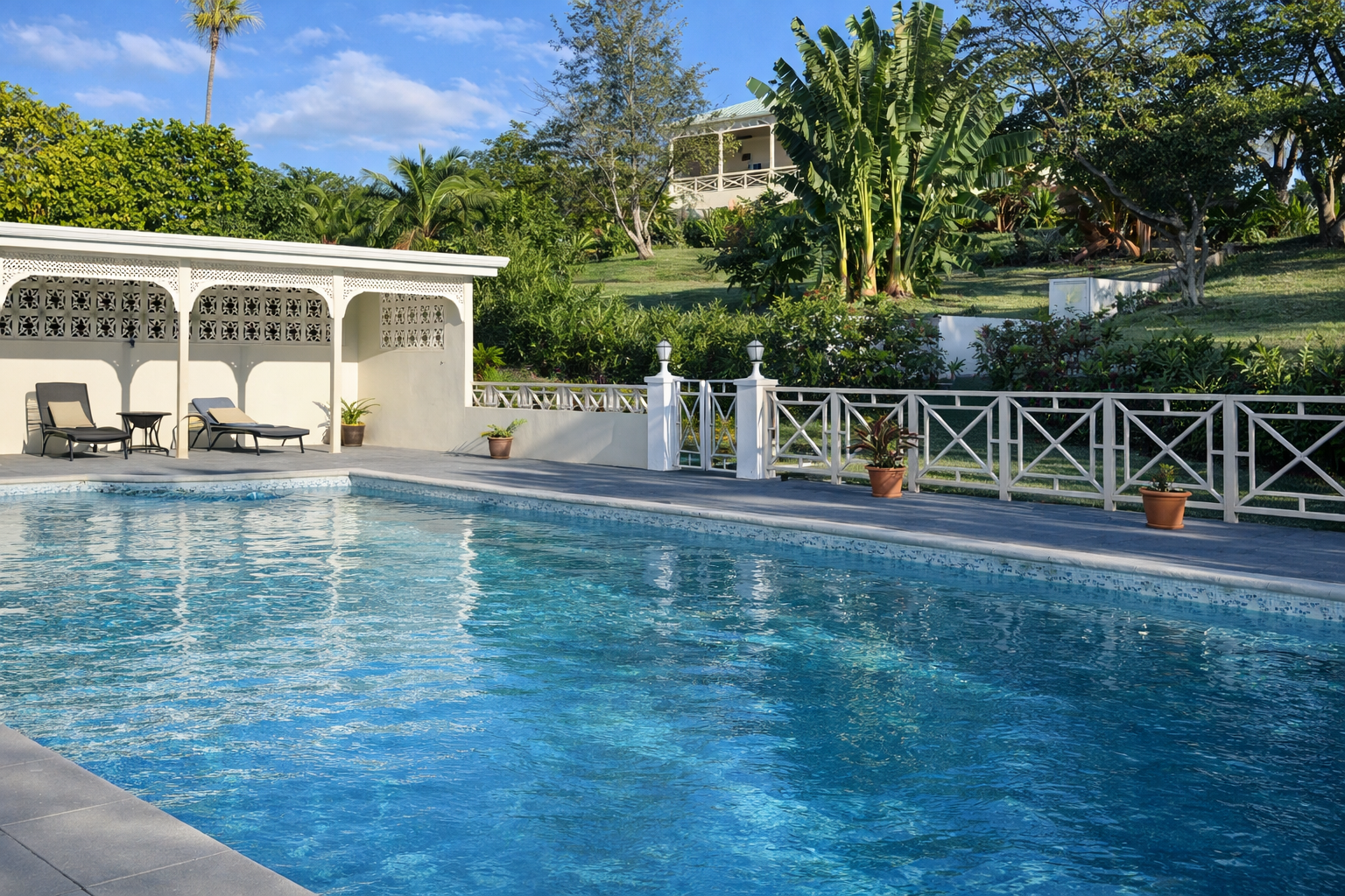 - Cabana provides shade, and a selection of reclining chairs invites relaxation.