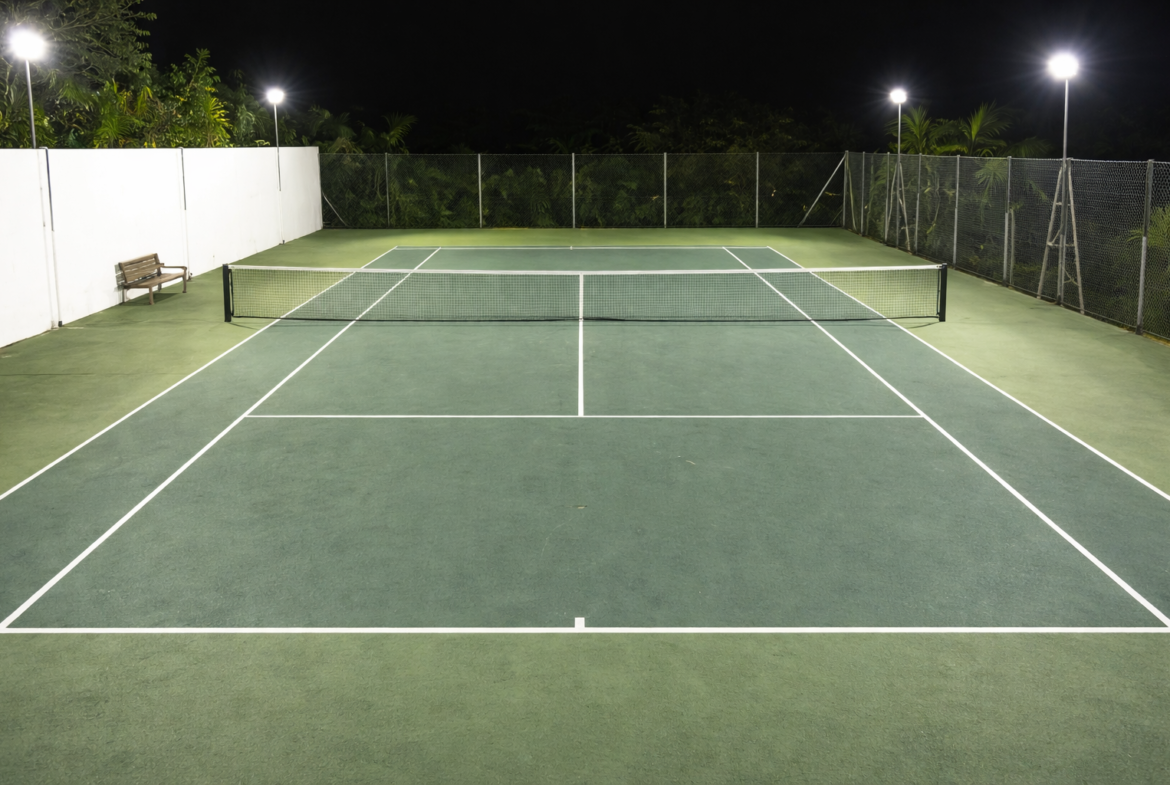 - Private court landscaped into the hillside with flood lighting for evening matches.