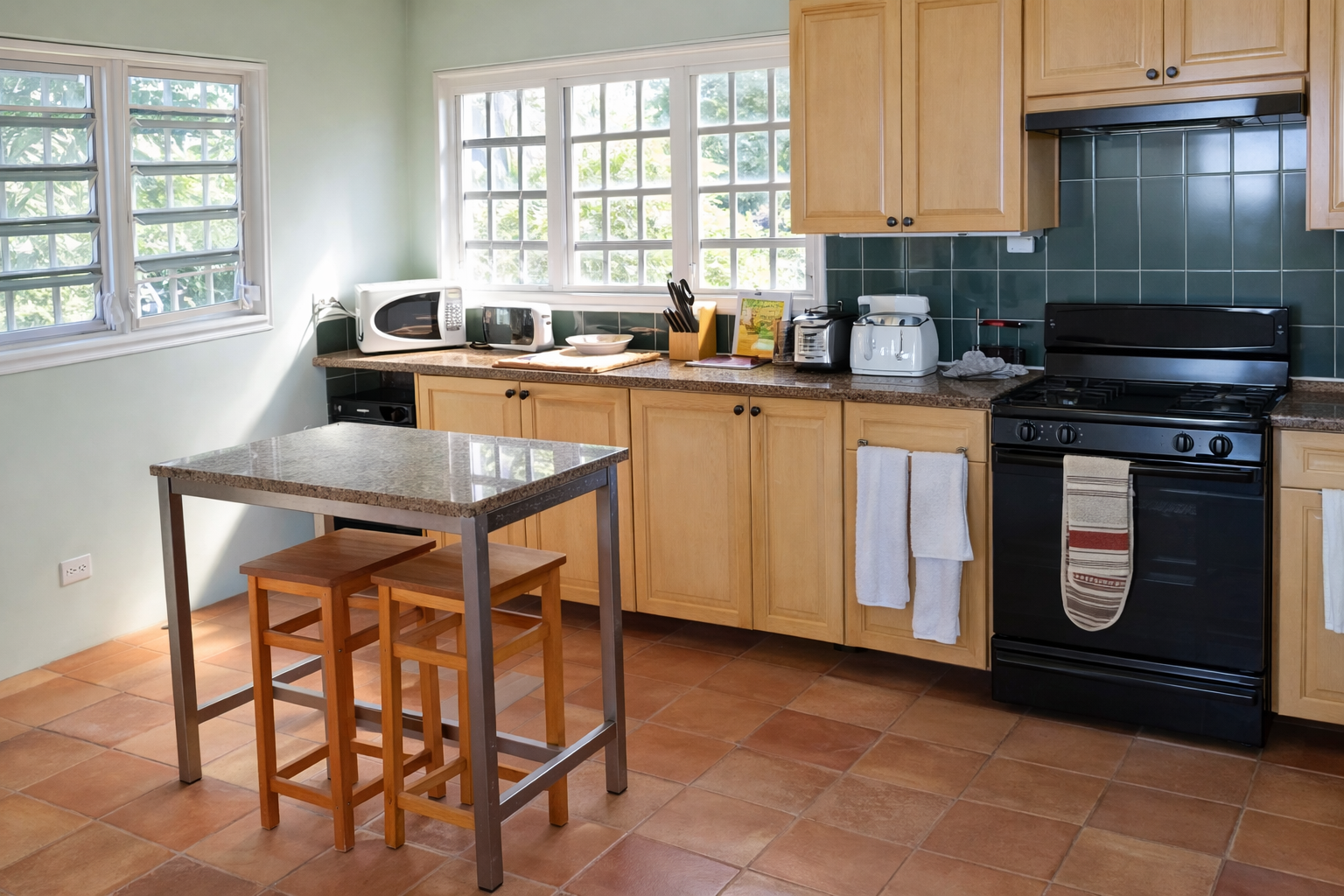 - Spacious kitchen equipped for large gatherings with solid maple furniture, Italian granite counter-tops, and a Spanish tiled floor.