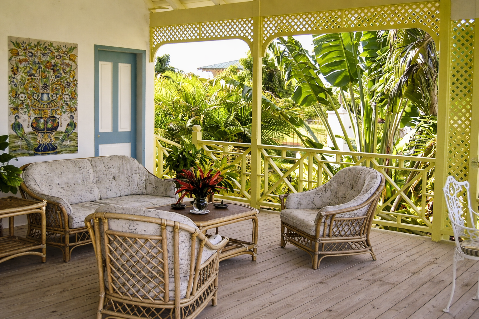 - Main verandah with stunning views, dining space, and rattan furniture.