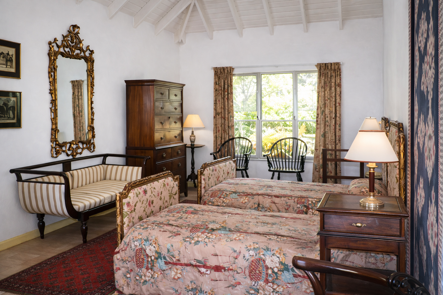 - Rooms adorned with Lloyd Loom, rattan, teak, antique furnishings, vibrant fabrics, period accessories, and historic pieces.