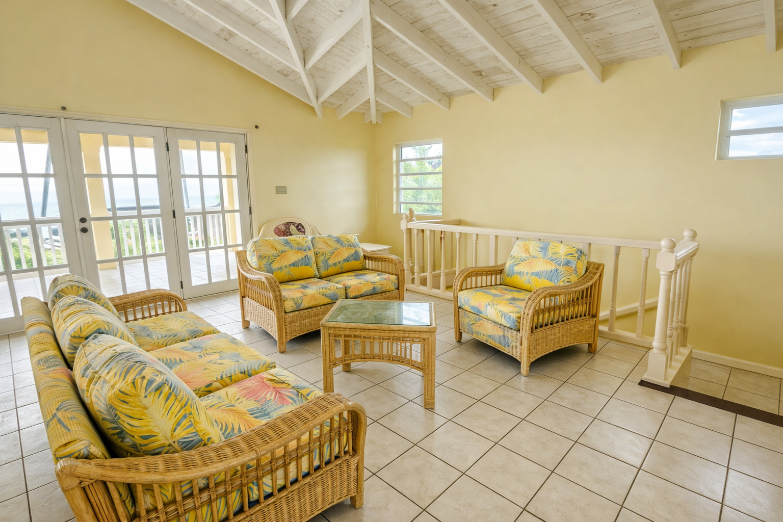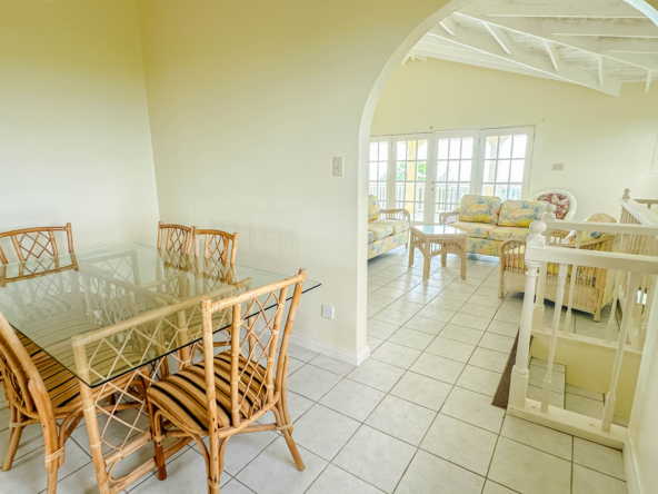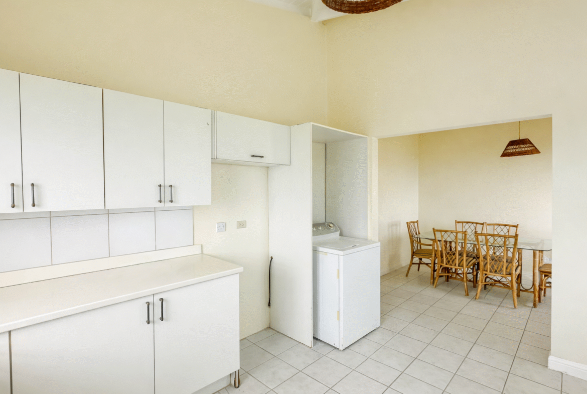 The upper level features two spacious bedrooms and two bathrooms, including a comfortable master suite with a private ensuite. A well-sized kitchen flows effortlessly into the adjoining dining area, creating an inviting setting for everyday living and entertaining. The bright and airy living room opens onto a deep east-facing veranda, where breathtaking views of the ocean and surrounding mountains provide a serene backdrop for morning coffee or sunset relaxation.